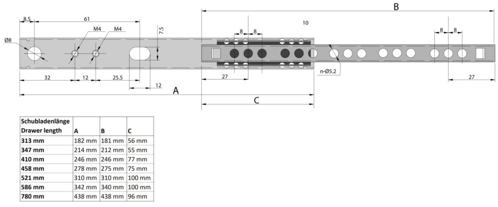 Application: Le système de guidage de tiroir en bois d’une largeur de rainure de 17 mm peut être utilisé de différentes manières. Glissière à billes de 17 mm avec des propriétés de roulement de haute qualité, parfaite pour l’installation dans les parois de salon, les armoires de cuisine, les meubles de salon, de salle de bain & de bureau. L’ouverture maximale des tiroirs permet d’accéder facilement aux objets à ranger dans les tiroirs. Le guidage précis des billes dans les chemins de roulement assure une grande stabilité. Le rail de guidage peut être étendu dans les deux sens et forme avec la cage à billes une unité complète et indissociable. Le rail de roulement à billes est en acier de haute qualité et a ensuite été galvanisé. Caractéristiques :