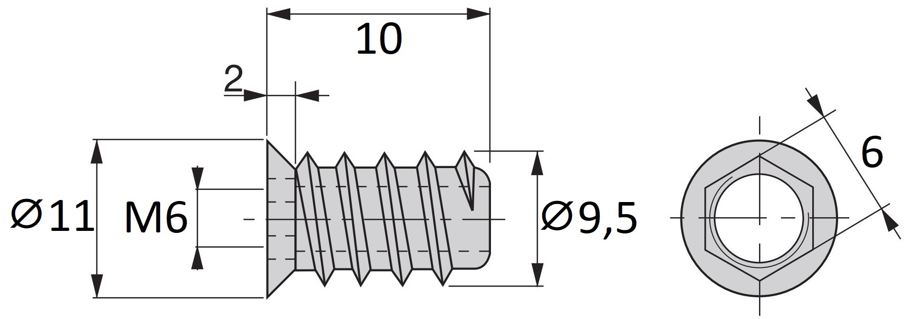 La douille à visser 8028001 a un filetage extérieur autotaraudeur ⌀8 mm pour le bois et un filetage métrique intérieur M6 dans lequel des vis métriques ou une tige filetée peuvent être vissées, ce qui permet un raccordement parfait et stable du bois plusieurs fois.