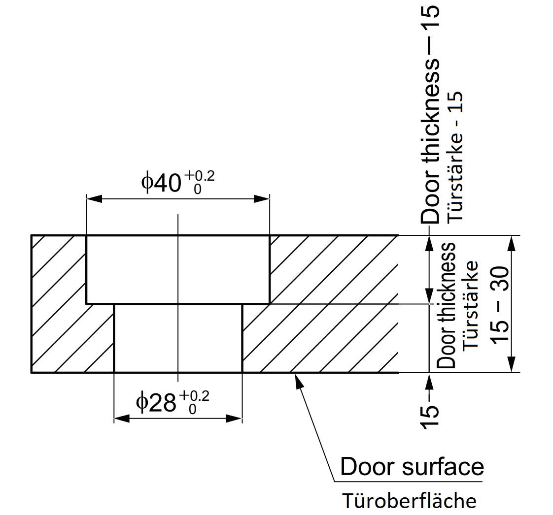 • Pour l’installation, un trou d’un diamètre de ⌀28 mm (1-7/64″) doit être percé à l’avant