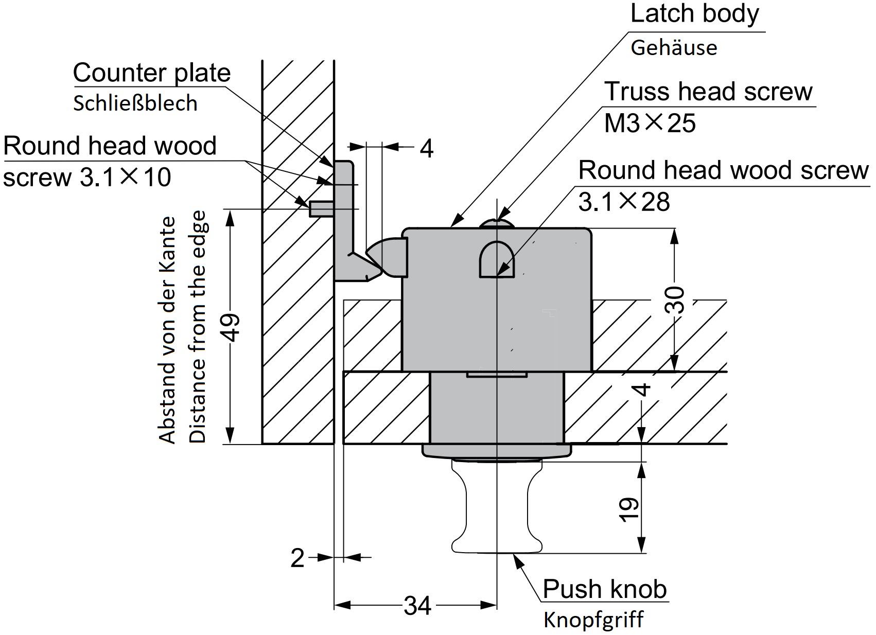 Il est également possible de l’installer à partir d’une épaisseur de porte de 11 mm (7/16″) à l’aide de l’entretoise PKL/WHT en option (l’entretoise PKL/WHT n’est pas incluse, veuillez commander séparément). Pour ouvrir la porte du meuble, il faut appuyer sur la poignée de la fermeture à bouton-poussoir PKL-08/CR et PKLB et donc la relâcher. Le bouton-poussoir PKL-08/CR et PKLB sert de poignée pratique lorsqu’il est ouvert.