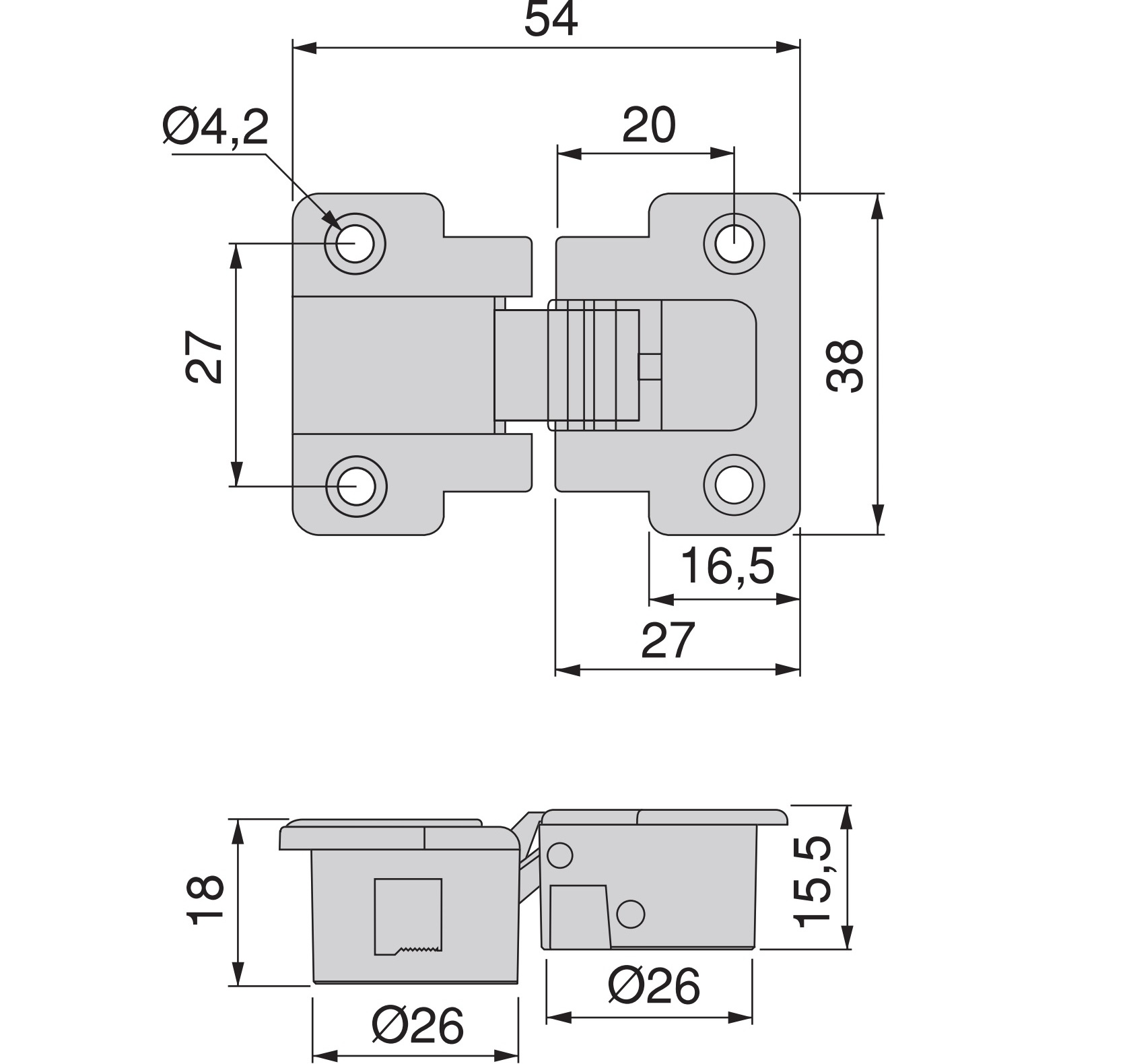 - La longueur totale de la charnière à rabat (montée) : 54 mm (2-1/8 »)