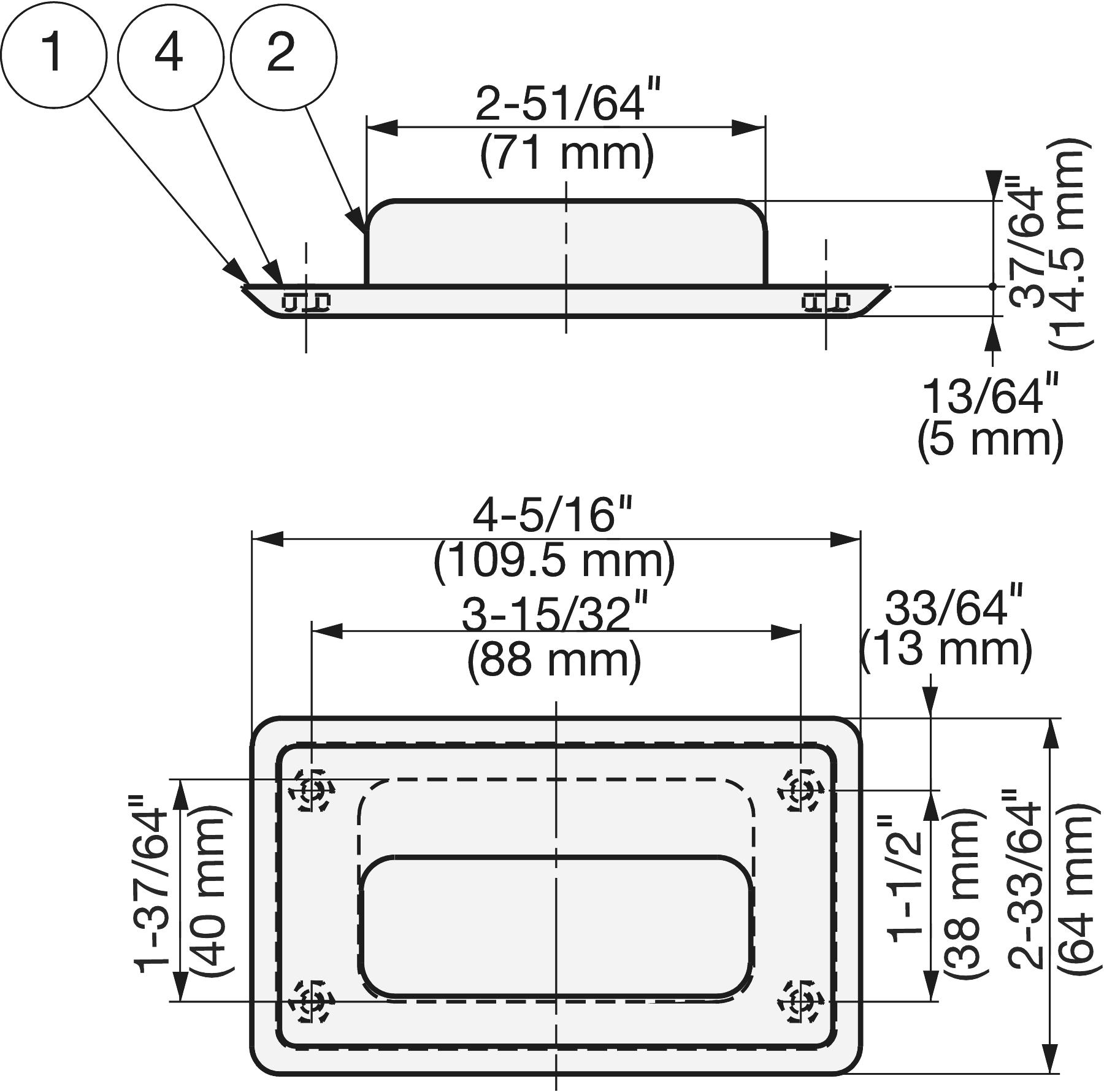 - Pour le montage, une découpe (L x H) de 73 mm (2-7/8 ») x 42 mm (1-21/32 ») doit être réalisée à l’avant