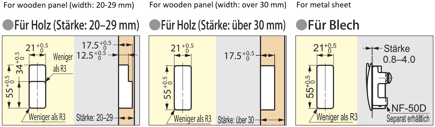 - Le support de montage L.NF-50 est disponible pour le montage en tôle (pour plus de détails, voir
