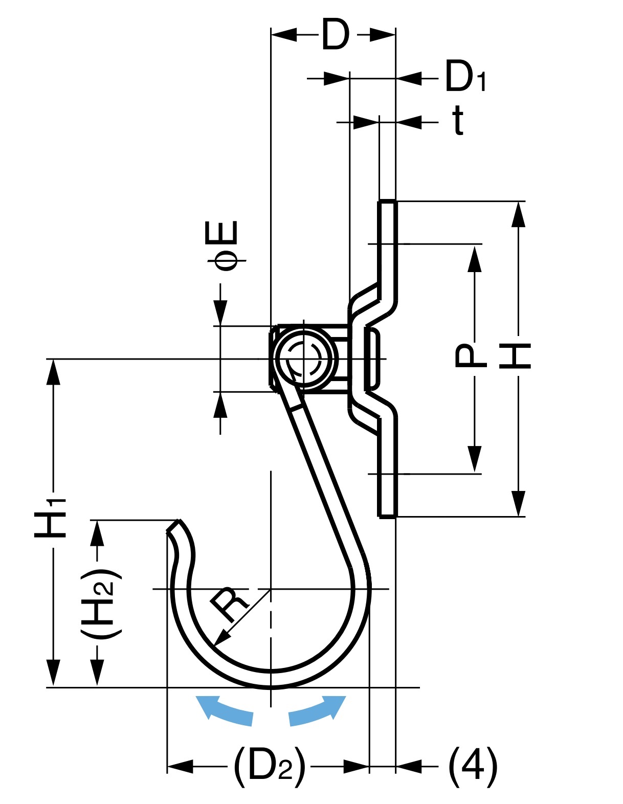Crochets en acier inoxydable UJ-040 et UJ-050. Pour les valeurs D, D1, D2, E, H, H1, H2, P et t s. Tableaux ci-dessous.