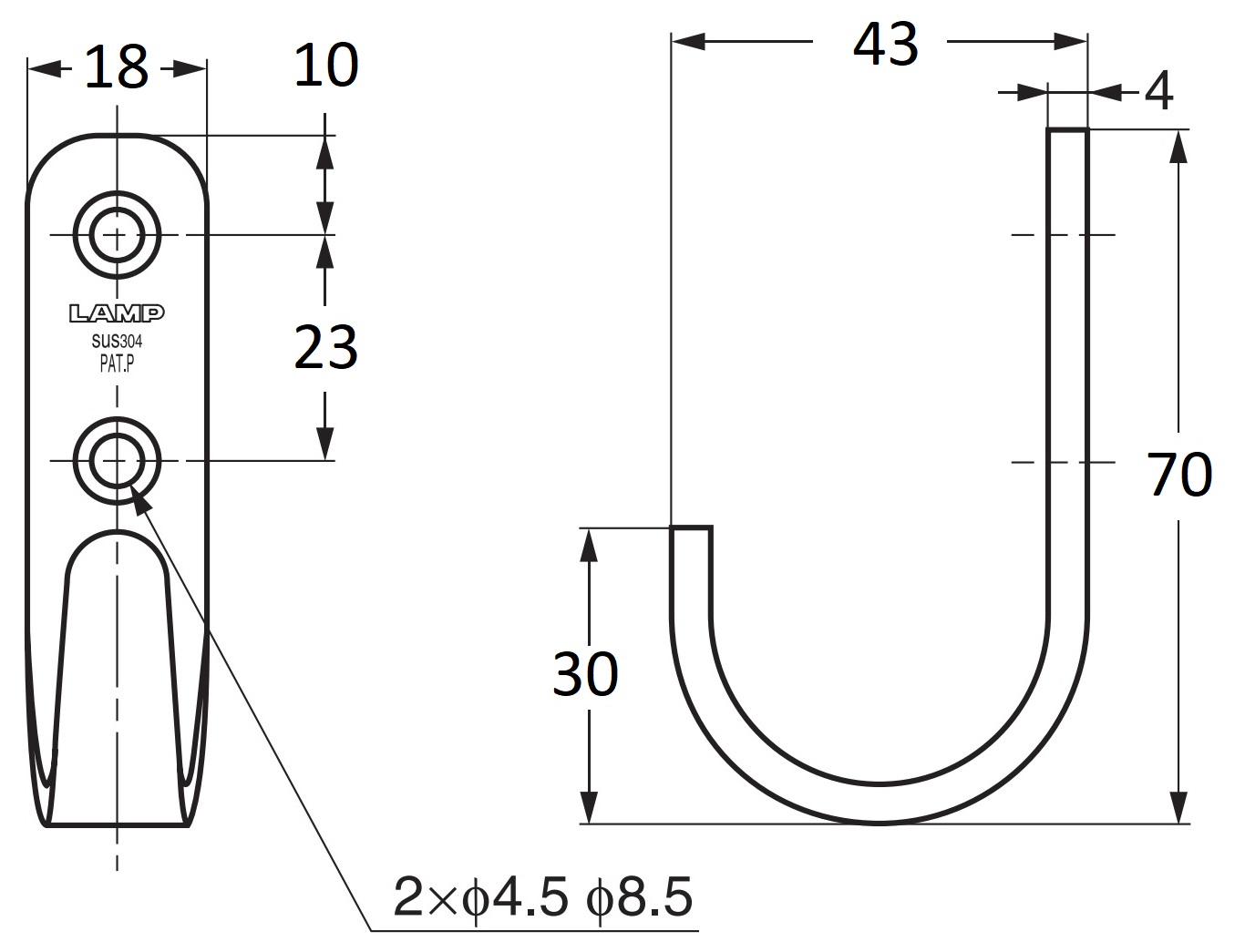 - Les crochets muraux en acier inoxydable HJT-70S ont deux trous de montage d’un diamètre de ⌀4,5 mm (11/64″), avec fraisage