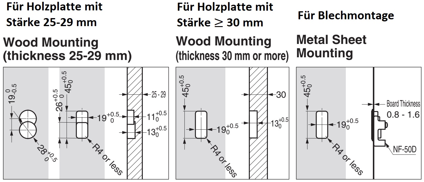 - Vis recommandées : Pour montage en bois (épaisseur 25-29 mm) : 4 vis autotaraudeuses cruciformes à tête plate de 15 mm. Pour montage en bois (épaisseur à partir de 30 mm) : 4 vis autotaraudeuses cruciformes de 20 mm (pour plus de détails, voir