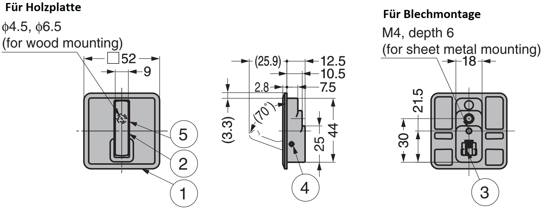 - Le crochet à ressort NF-K52-BL a un trou de montage d’un diamètre de ⌀4,5 mm, avec fraise pour le montage dans un panneau en bois