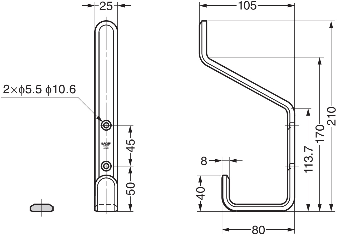 Grand crochet double universel de haute qualité avec deux crochets d’extrémité, XL-SB-210-S, 80 mm, de Sugatsune, finition satinée. Dessin technique