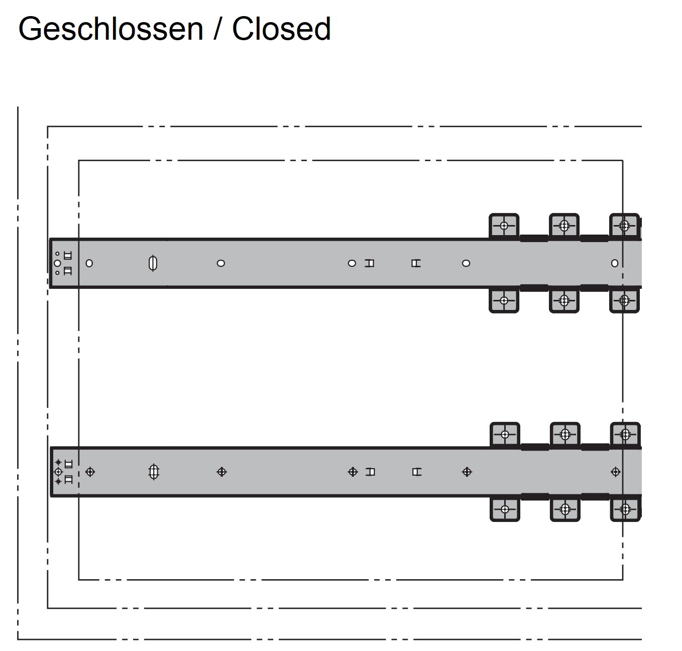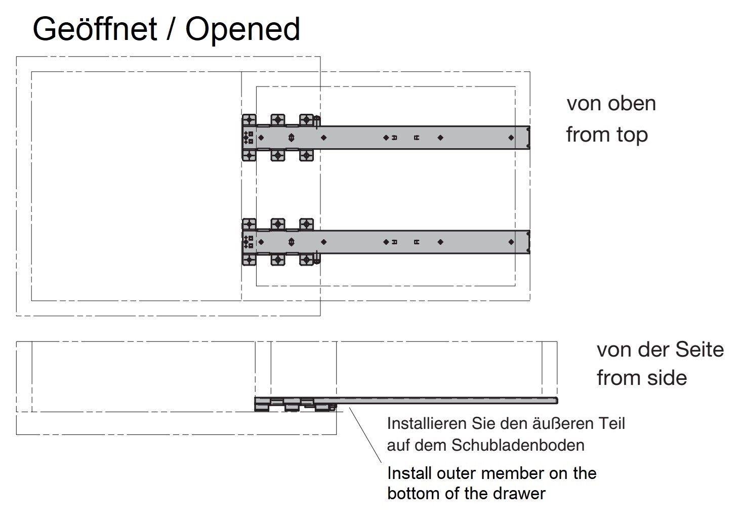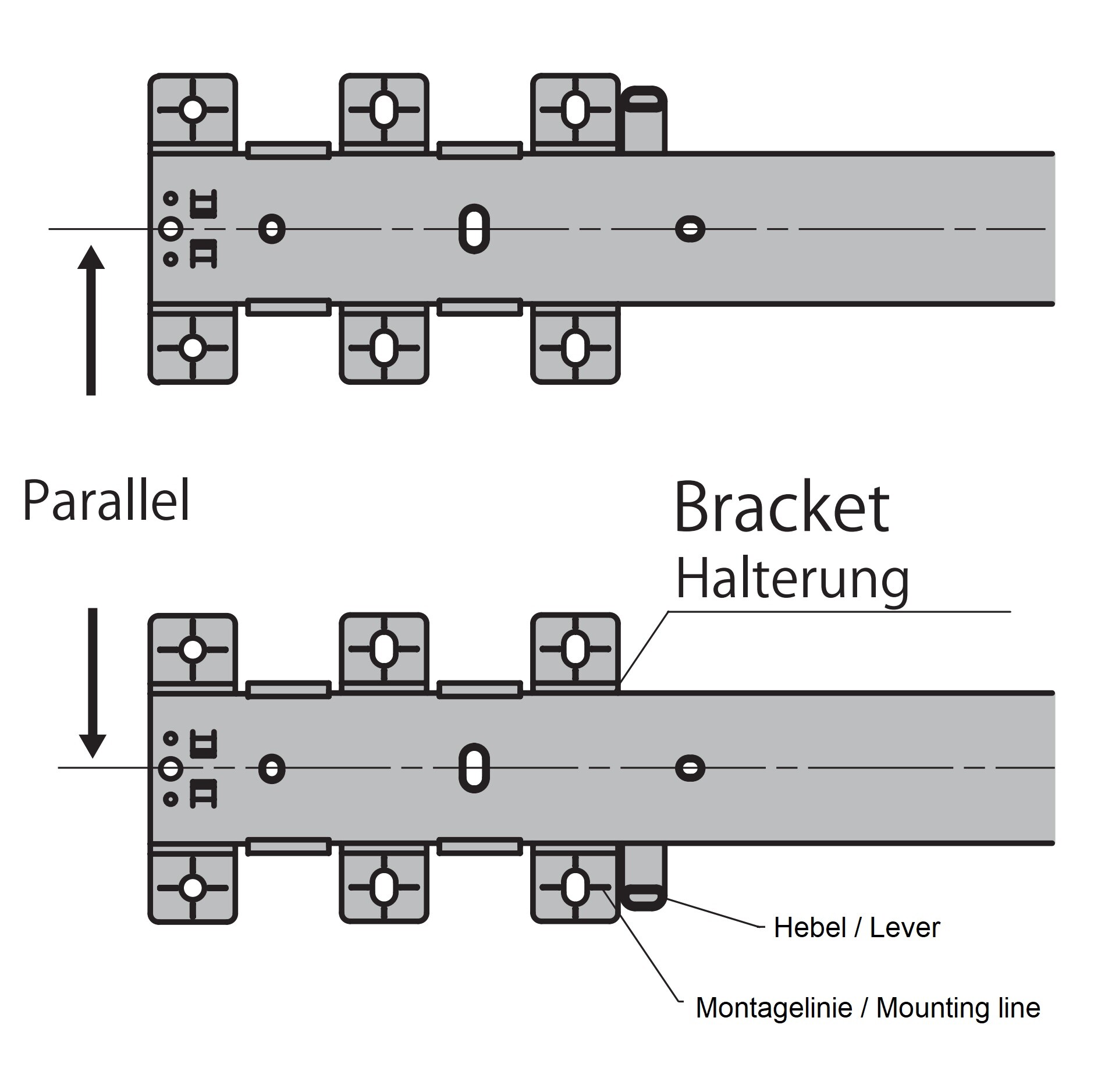 Les deux glissières doivent être montées sur la partie inférieure du tiroir (sur le fond du tiroir). Pour garantir un déroulement optimal des mouvements, ils doivent être placés parallèlement les uns aux autres.
