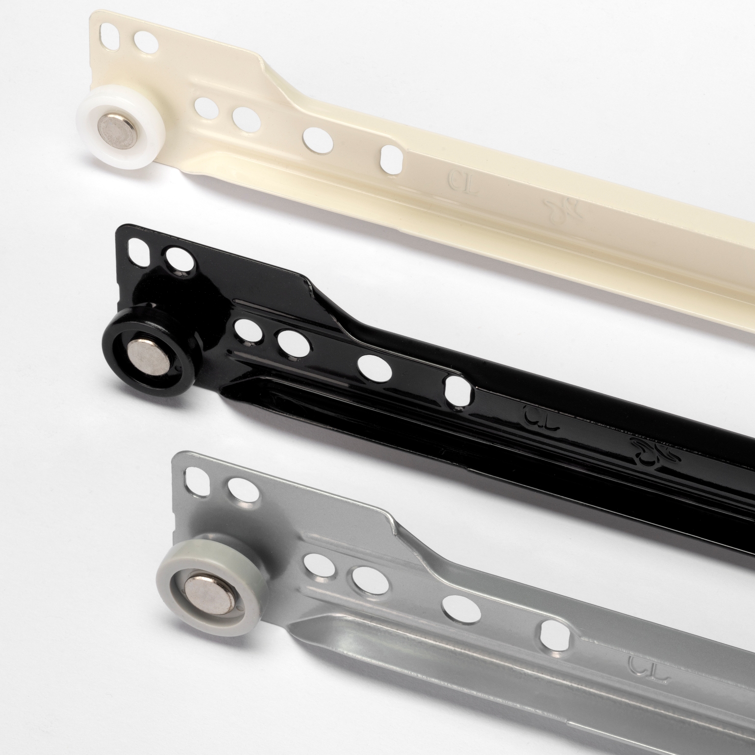 Les rails de tiroir à extension partielle sont disponibles en trois couleurs de surface : blanc, noir et gris métallisé.