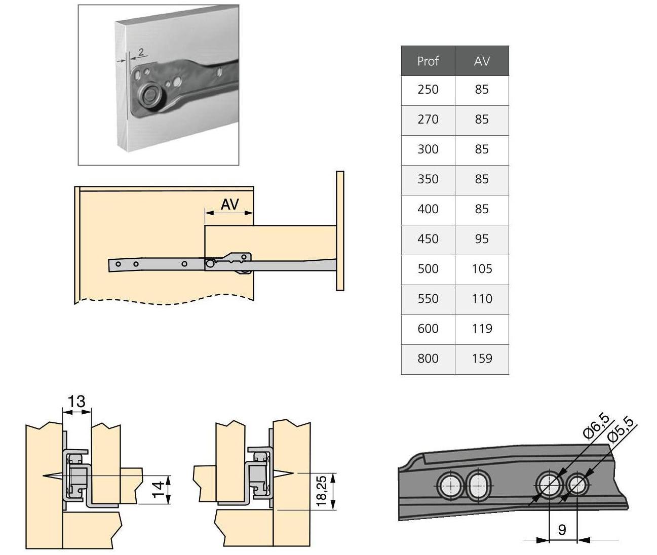 - Les coulissants de tiroir sont installés avec des vis Euro à tête plate de ⌀5 mm ou avec des vis à tête plate de diamètre ⌀3,5 mm
