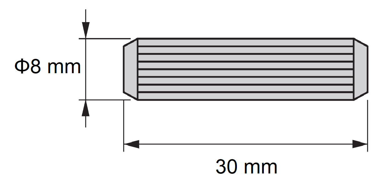 Cheville longue en bois de hêtre, surface: nervurée, 30 mm, par EMUCA. Dessin technique