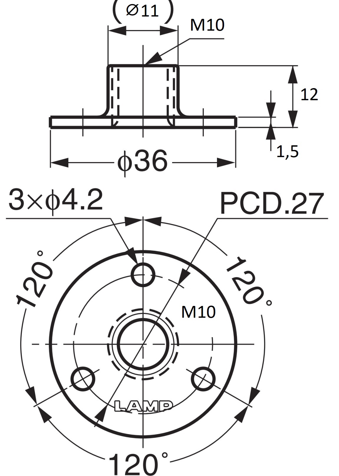 Plaque de montage ronde en 4 parties avec filetage M10 et trois trous de montage, plaque à visser, en acier inoxydable (V2A), surface : poli brillant, AP36-M10, dimensions : 36 mm (1,5 »)