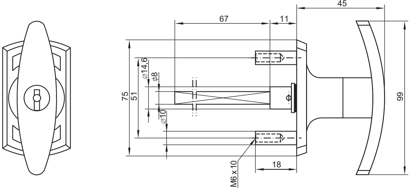 Poignée d’armoire de commande verrouillable de haute qualité avec cylindre de fermeture, en zamak, avec carré de 8 mm et deux clés, de SISO, version : à verrouillage différent. Dessin technique